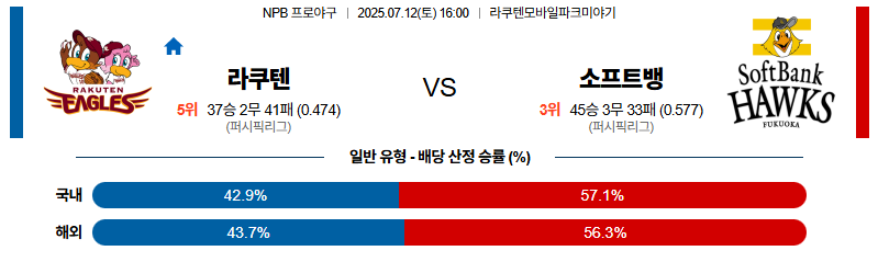 예상 스코어는 4:3으로 소프트뱅크의 승리를 추천드립니다. 승패는 소프트뱅크, 핸디는 라쿠텐 승리, 언더 오버는 오버로 예상합니다.
