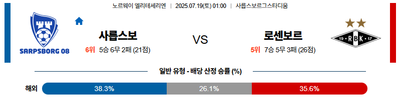사릅스보르그 대 로젠보리 노르웨이1부 07월19일 맞대결 생중계, 스포츠중계, 스포츠분석