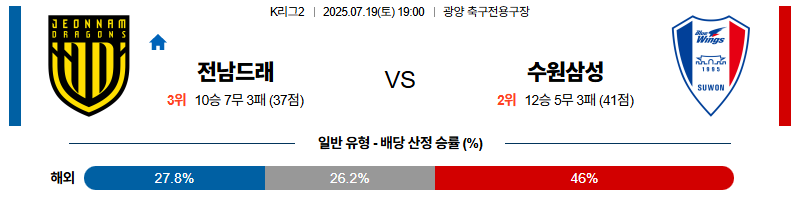 전남 대 수원삼성 K리그2 07월19일 맞대결 생중계, 스포츠중계, 스포츠분석