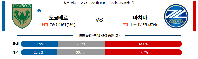 마치다는 전술 완성도와 체력 운영, 전방 압박의 강도에서 도쿄베르디를 앞서고 있으며, 도쿄베르디는 점유율을 유지하더라도 실속 없는 전개와 후반 약점이 반복되고 있습니다. 마치다의 강한 압박에 고전할 가능성이 높습니다. 흐름, 심리, 결과가 모두 일치하는 경기로, 마치다가 흔들림 없이 밀어붙일 가능성이 큽니다.