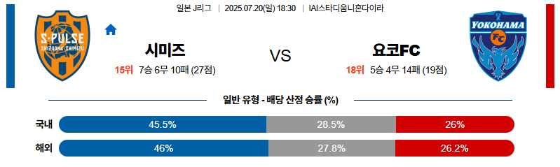 시미즈 대 요코하마FC J리그1 07월20일 맞대결 생중계, 스포츠중계, 스포츠분석