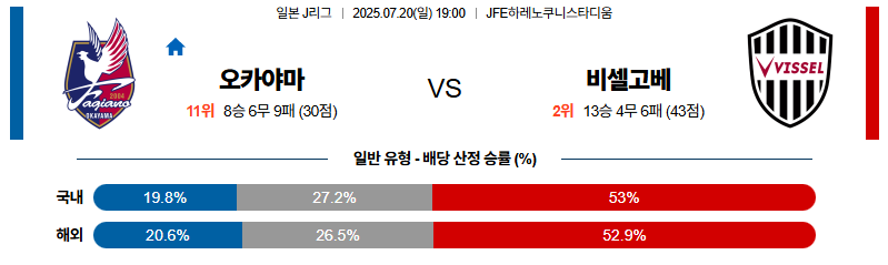 오카야마 대 비셀고베 J리그1 07월20일 맞대결 생중계, 스포츠중계, 스포츠분석