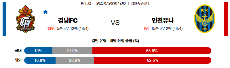 경남 대 인천 K리그2 07월20일 맞대결 생중계, 스포츠중계, 스포츠분석