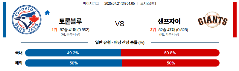토론토 대 샌프란시스코 MLB 07월21일 맞대결 생중계, 스포츠중계, 스포츠분석