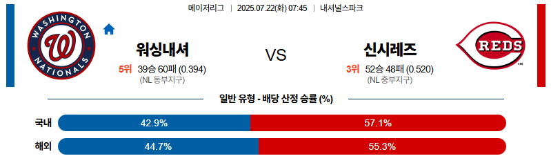 신시내티 레즈가 원정에서 후반 경기력이 좋은 반면, 워싱턴은 원정에서 약점을 보이고 있어 신시내티의 승리가 예상됩니다.