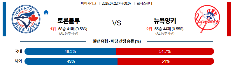 토론토 대 뉴욕양키스 MLB 07월22일 맞대결 생중계, 스포츠중계, 스포츠분석