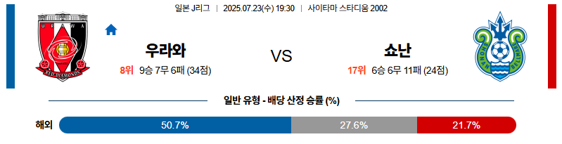 우라와 대 쇼난 J리그1 07월23일 맞대결 생중계, 스포츠중계, 스포츠분석