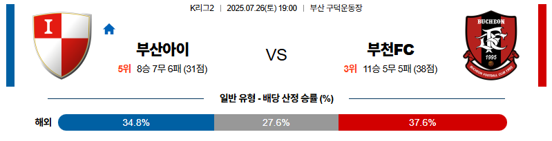 부산은 단조로운 공격 패턴에 대한 노출과 수비 집중력 저하라는 구조적인 한계를 드러내고 있습니다. 반면 부천은 다양한 공격 조합과 전방 변칙 활용으로 전술적 주도권을 쥐고 있으며, 현재의 흐름을 이어가고 있습니다. 외국인 공격수들의 연계 완성도와 윙백을 활용한 전진 타이밍이 완벽하게 살아나고 있는 시점입니다. 이 경기는 흐름과 완성도, 심리 모두에서 부천이 앞서며 반드시 승부를 가져갈 기회입니다.