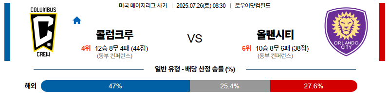 콜럼버스 대 올랜도시티 메이저리그사커 07월26일 맞대결 생중계, 스포츠중계, 스포츠분석
