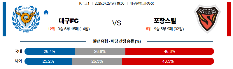 대구 대 포항 J리그1 07월27일 맞대결 생중계, 스포츠중계, 스포츠분석