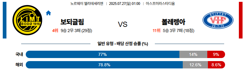 보되글림트 대 볼레렝가 노르웨이1부 07월27일 맞대결 생중계, 스포츠중계, 스포츠분석