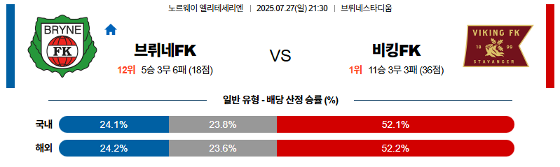 브뤼네 대 바이킹 노르웨이1부 07월27일 맞대결 생중계, 스포츠중계, 스포츠분석