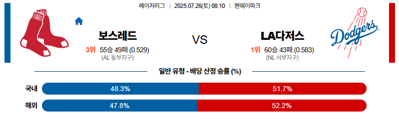 보스턴 대 LA다저스 MLB 07월26일 맞대결 생중계, 스포츠중계, 스포츠분석