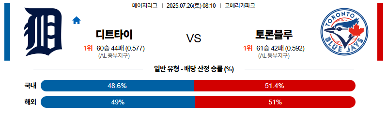 디트로이트 대 토론토 MLB 07월26일 맞대결 생중계, 스포츠중계, 스포츠분석