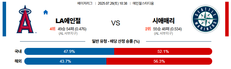 LA에인절스 대 시애틀 MLB 07월26일 맞대결 생중계, 스포츠중계, 스포츠분석