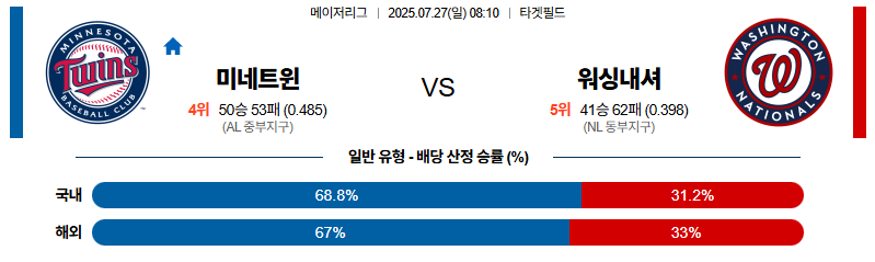 미네소타 대 워싱턴 MLB 07월27일 맞대결 생중계, 스포츠중계, 스포츠분석