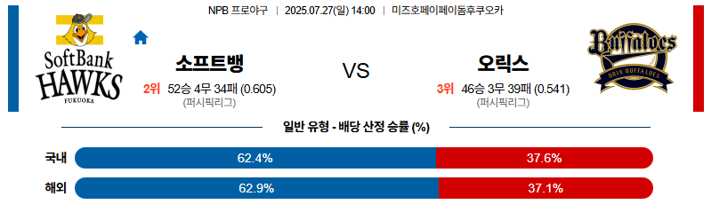 소프트뱅크 대 오릭스 NPB 07월27일 맞대결 생중계, 스포츠중계, 스포츠분석