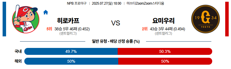 히로시마 대 요미우리 NPB 07월27일 맞대결 생중계, 스포츠중계, 스포츠분석