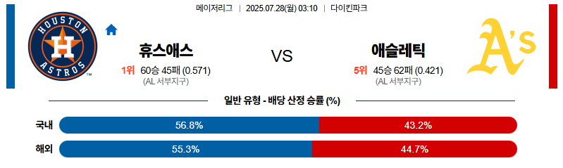 휴스턴 대 애슬레틱스 MLB 07월28일 맞대결 생중계, 스포츠중계, 스포츠분석