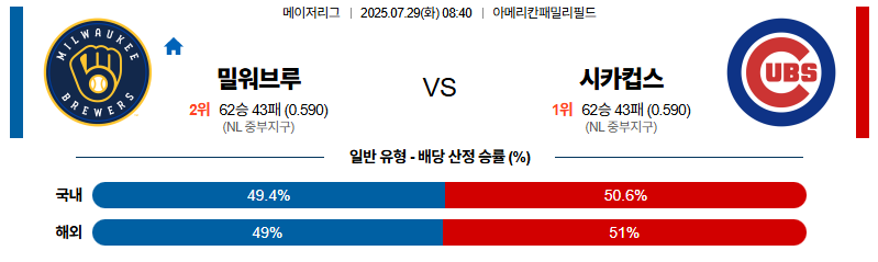 밀워키 대 시카고컵스 MLB 07월29일 맞대결 생중계, 스포츠중계, 스포츠분석
