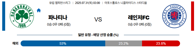 파나시나이코스 대 레인저스 UEFA챔피언스리그 07월31일 맞대결 생중계, 스포츠중계, 스포츠분석