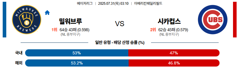 밀워키 대 시카고컵스 MLB 07월31일 맞대결 생중계, 스포츠중계, 스포츠분석