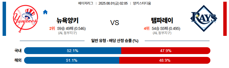 뉴욕양키스 대 탬파베이 MLB 08월01일 맞대결 생중계, 스포츠중계, 스포츠분석