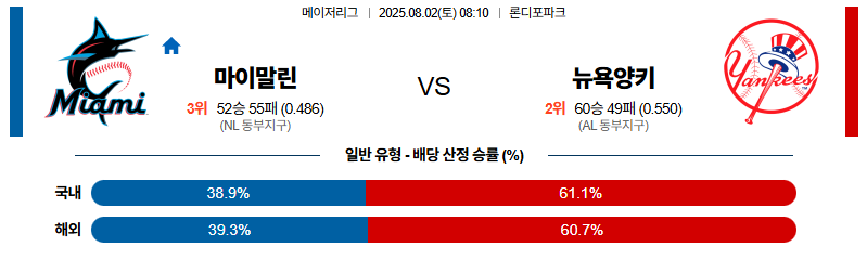 마이애미 대 뉴욕양키스 MLB 08월02일 맞대결 생중계, 스포츠중계, 스포츠분석