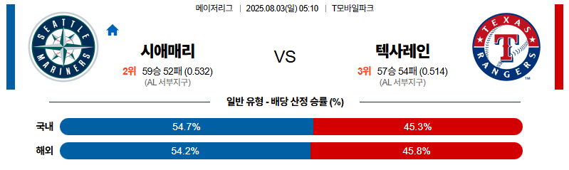 시애틀 대 텍사스 MLB 08월03일 맞대결 생중계, 스포츠중계, 스포츠분석