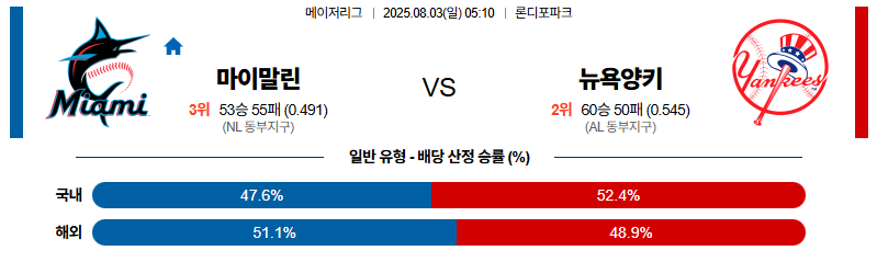 마이애미 대 뉴욕양키스 MLB 08월03일 맞대결 생중계, 스포츠중계, 스포츠분석