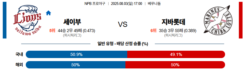 세이부 대 지바롯데 NPB 08월03일 맞대결 생중계, 스포츠중계, 스포츠분석
