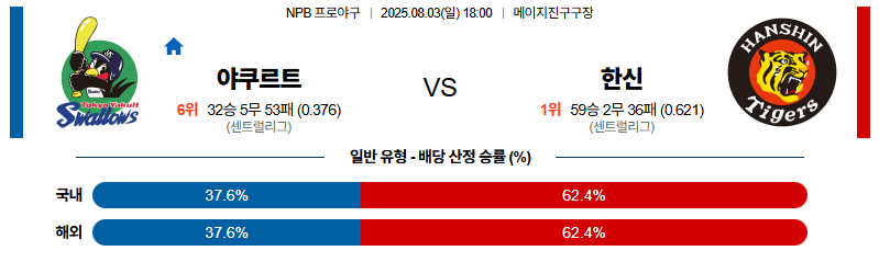 야쿠르트 대 한신 NPB 08월03일 맞대결 생중계, 스포츠중계, 스포츠분석