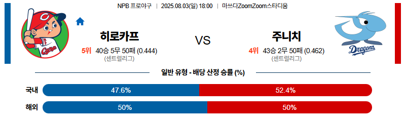 히로시마 대 주니치 NPB 08월03일 맞대결 생중계, 스포츠중계, 스포츠분석