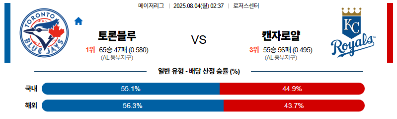토론토 대 캔자스시티 MLB 08월04일 맞대결 생중계, 스포츠중계, 스포츠분석
