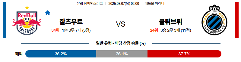 잘츠부르크는 압박과 템포 전환의 조합이 완성 단계에 접어들며, 홈 경기에서의 몰아치는 힘이 강합니다. 클럽브뤼헤는 공격 전개 흐름은 갖추고 있으나, 마무리와 수비 응집력에서 명확한 불안 요소가 반복되고 있습니다. 이 경기는 전술적 디테일과 후반 집중력 모두에서 잘츠부르크가 앞서는 흐름입니다. 상대보다 빨리 몰아치고, 정확히 마무리할 수 있는 쪽이 승기를 잡을 것입니다.