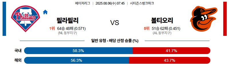 필라델피아 대 볼티모어 MLB 08월06일 맞대결 생중계, 스포츠중계, 스포츠분석