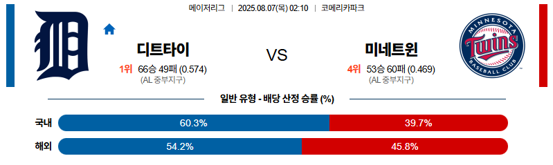 디트로이트 대 미네소타 MLB 08월07일 맞대결 생중계, 스포츠중계, 스포츠분석