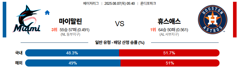 마이애미 대 휴스턴 MLB 08월07일 맞대결 생중계, 스포츠중계, 스포츠분석