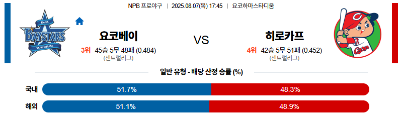 요코하마 대 히로시마 NPB 08월07일 맞대결 생중계, 스포츠중계, 스포츠분석
