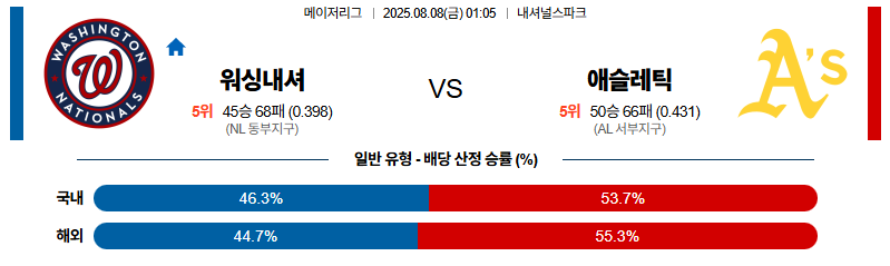 워싱턴 대 애슬레틱스 MLB 08월08일 맞대결 생중계, 스포츠중계, 스포츠분석
