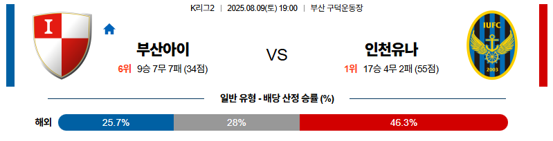 부산 대 인천 K리그2 08월09일 맞대결 생중계, 스포츠중계, 스포츠분석