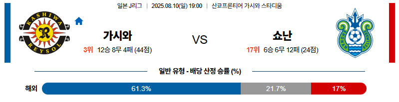 가시와레이솔 대 쇼난 J리그1 08월10일 맞대결 생중계, 스포츠중계, 스포츠분석