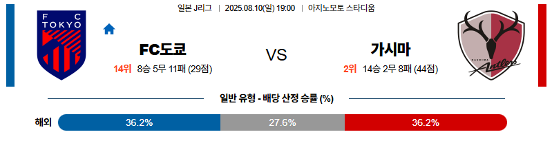 FC도쿄 대 가시마 J리그1 08월10일 맞대결 생중계, 스포츠중계, 스포츠분석