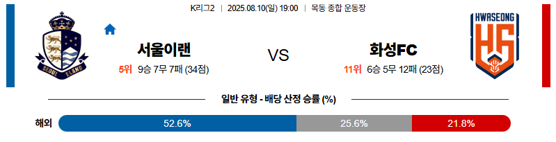 서울이랜드는 전술적 유기성과 전개 속도 모두에서 안정된 흐름을 보여주고 있으며, 화성은 어린 자원들의 체력 분배와 수비 전환 타이밍에서 약점을 반복하고 있습니다. 구조적 안정감과 공격 마무리의 날카로움을 갖춘 서울이랜드가 이 경기 흐름을 장악할 가능성이 높습니다.