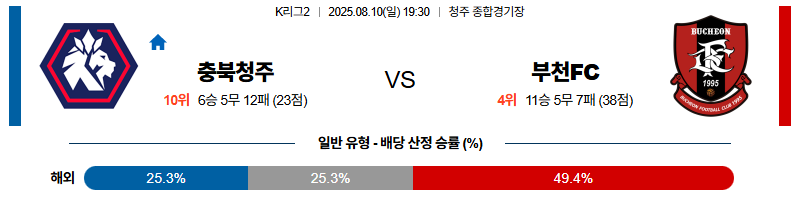 부천은 템포 조절과 압박 완성도에서 상대보다 명확히 앞선 팀이며, 충북청주는 핵심 미드필더 부재로 전술 밸런스가 무너질 가능성이 높습니다. 이 경기는 수비 공백을 간파할 수 있는 부천의 리듬이 흐름을 지배할 수 있는 경기로 예상됩니다.