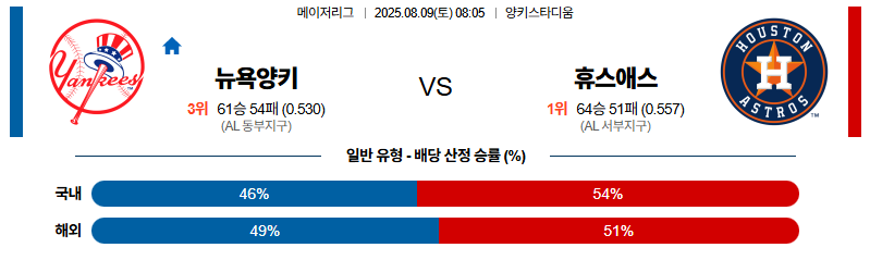 뉴욕양키즈 대 휴스턴 MLB 08월09일 맞대결 생중계, 스포츠중계, 스포츠분석