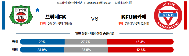 브뤼네 대 KFUM오슬로 노르웨이1부 08월11일 맞대결 생중계, 스포츠중계, 스포츠분석