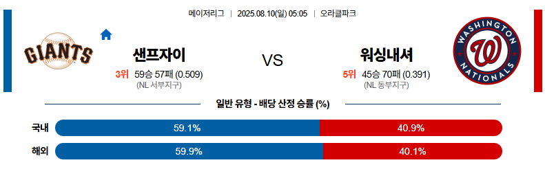 샌프란시스코 대 워싱턴 MLB 08월10일 맞대결 생중계, 스포츠중계, 스포츠분석