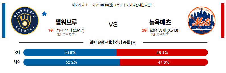 밀워키 대 뉴욕메츠 MLB 08월10일 맞대결 생중계, 스포츠중계, 스포츠분석