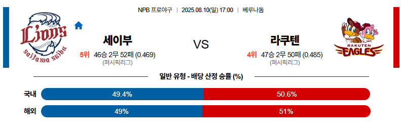 세이부 대 라쿠텐 NPB 08월10일 맞대결 생중계, 스포츠중계, 스포츠분석